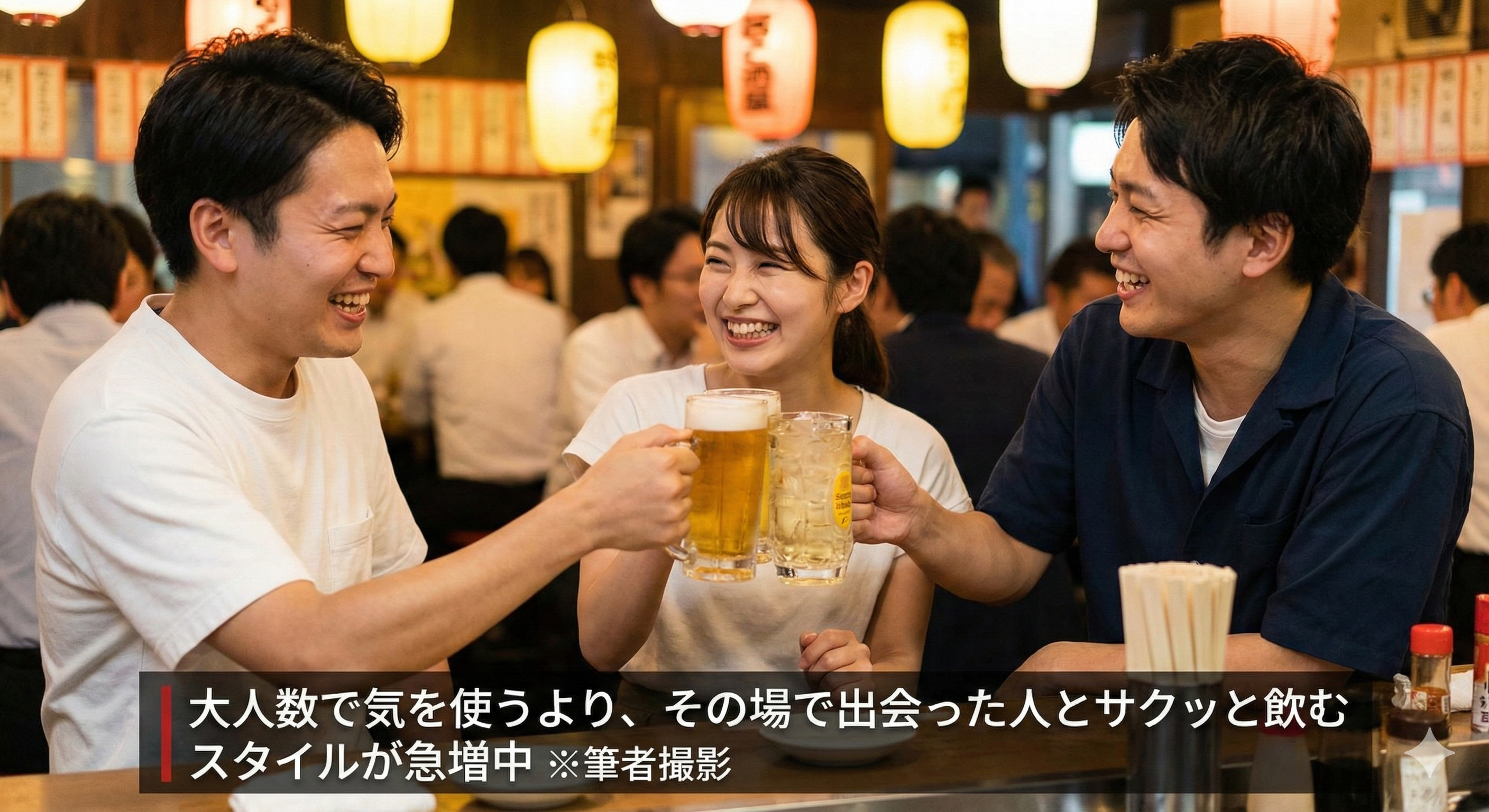 これまでの飲み会は、「事前に計画して集まる」のが当たり前でした。 しかし、忙しい現代人にとって、それはコストが高すぎます。